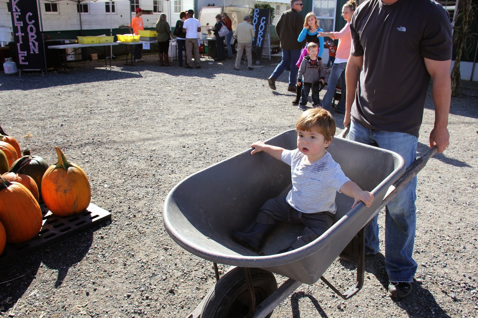 So, anyways, we had a great time…and I think Sam did as well. The place was pretty crowded so we decided to skip the hay rides and corn mazes, etc. Sam was too young to really enjoy those activities anyway; he was more than content to sit on the tractor with Gabe and “push” the wheelbarrow full of pumpkins. He tried so hard to push the wheelbarrow just like Daddy. It was adorable.
